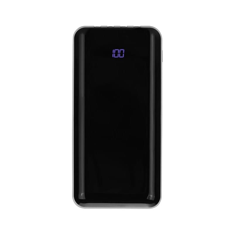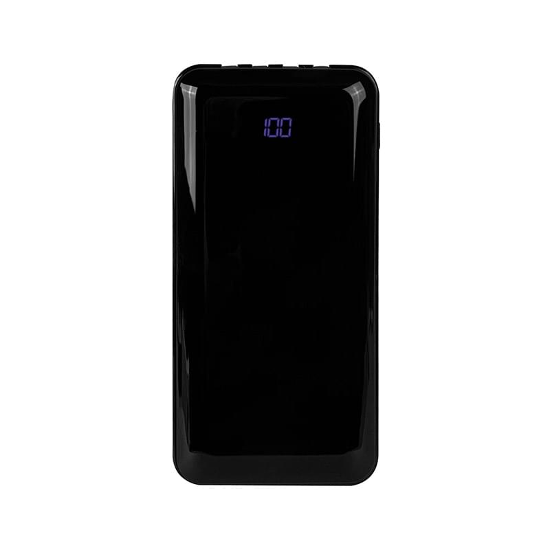 10;000mAh. USB output: DC5V/2.1A. LED display shows battery percentage. Includes lightning; micro USB and Type-C for charging devices. The attached Type-A cable charges the power bank. Powers devices requiring 5v charging.